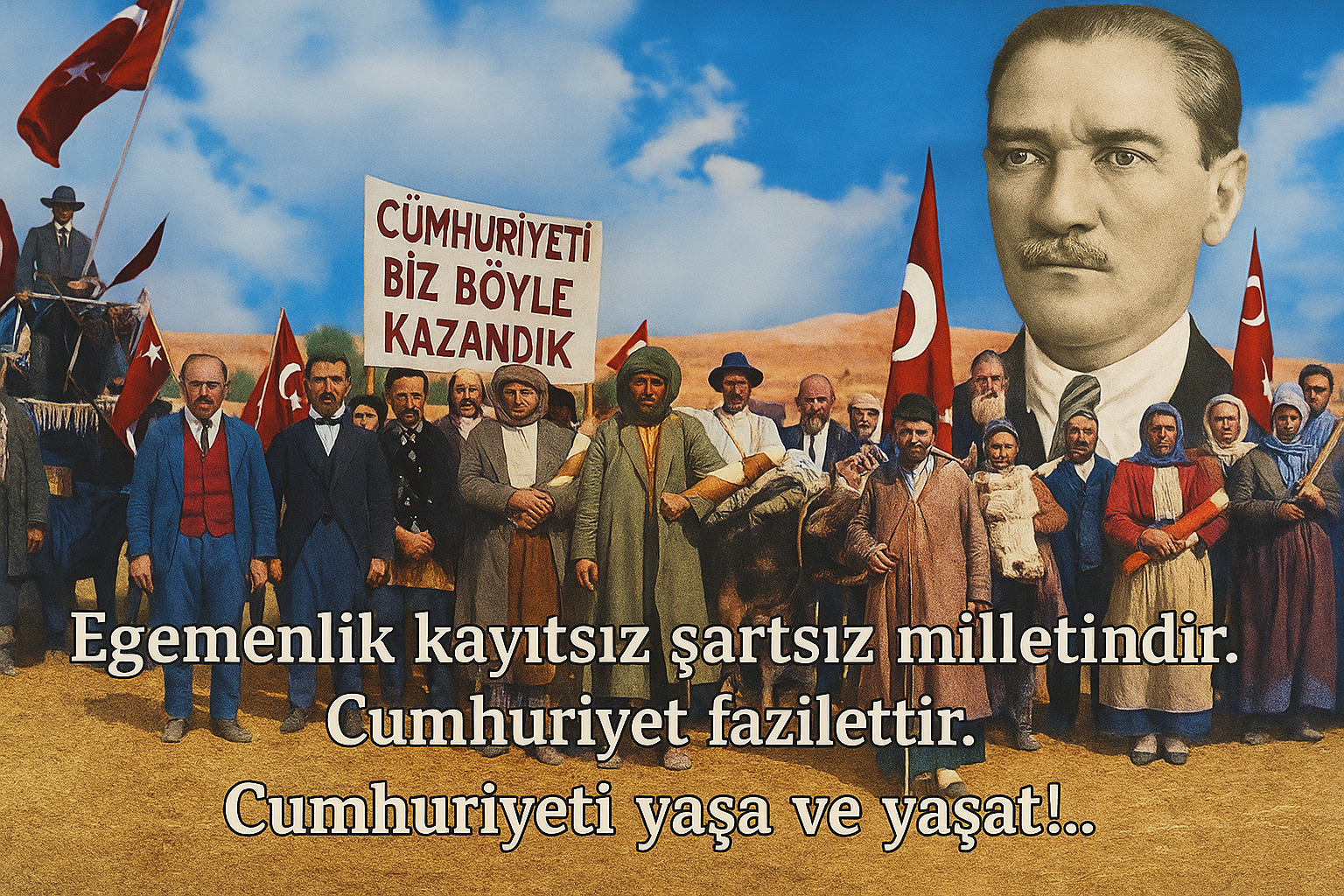 Arkadaşlar! Ben, Meclisi Âlinizin timsali olduğu Büyük Milletimin seciyelerine, ruhlarına, arzu ve emellerine tercüman olarak haykırıyor ve bütün cihana ilân ediyorum ki: Bundan sonra bu Devletin şekli doğrudan doğruya Cumhuriyettir. Millet; mukadderatına doğrudan doğruya hâkim vâzıulyeddir. Bunun hilâfında sefil ve fena emeller besliyen şahıslar ve tacidarlar kaani olsunlar ki: Milletin bu ebedi azmi karşısında daima ölmeye, daima gebermeye mahkûmdurlar.